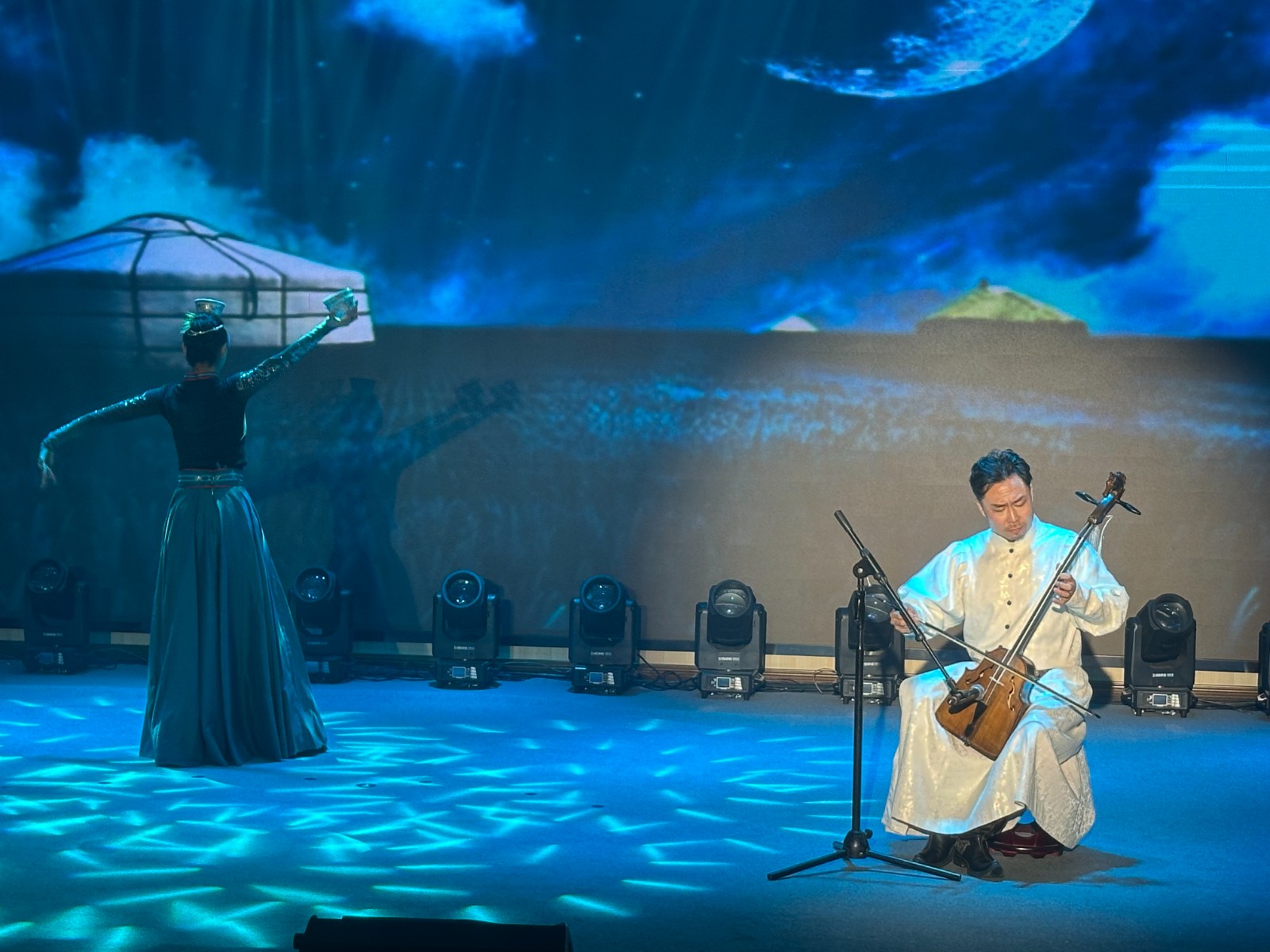 活动特邀中南民族大学优秀青年教师张卓、舞者石与洁助阵。张卓的马头琴独奏《万马奔腾》旋律激昂,石与洁的独舞《疾风中的马》舞姿铿锵,二者以精湛技艺再现万马奔腾的壮阔景象,传递草原豪情,将现场气氛推向高潮,赢得全场喝彩声连连。